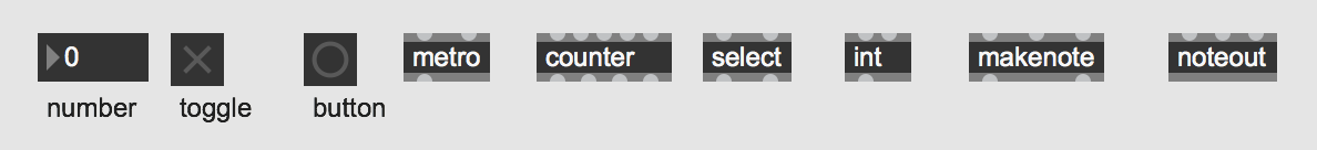 2. Voeg 5 [number]-objecten toe aan je patch waarmee je de noten van de verschillende steps van de sequencer kunt aanpassen.